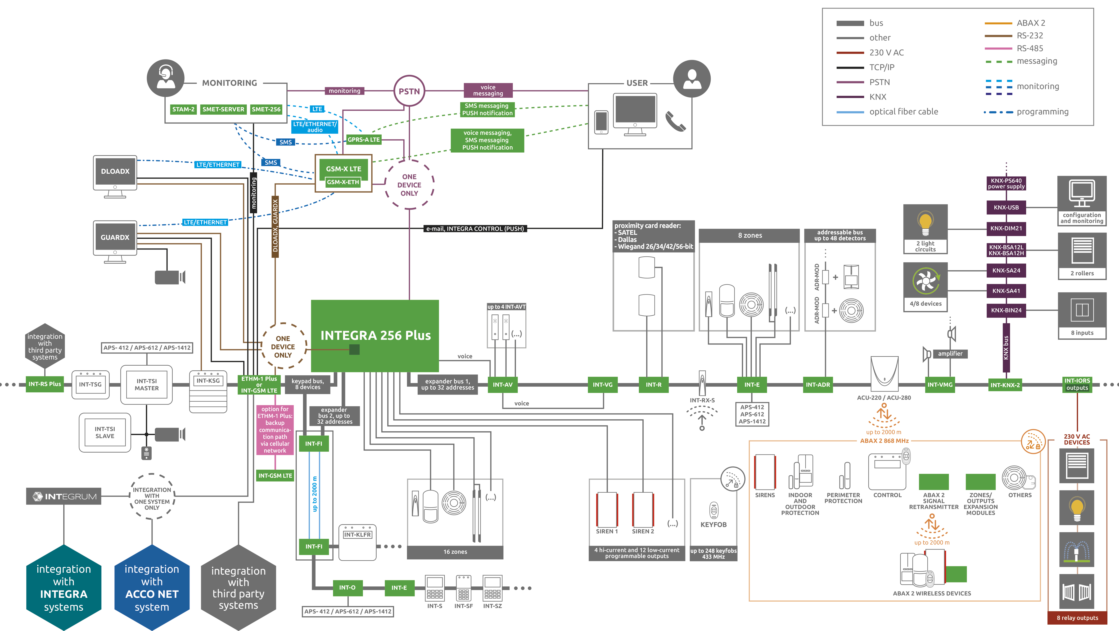 Integra Plus -järjestelmän periaatekaavio, josta helppo huomata järjestelmän monipuolisuus ja modulaarisuus